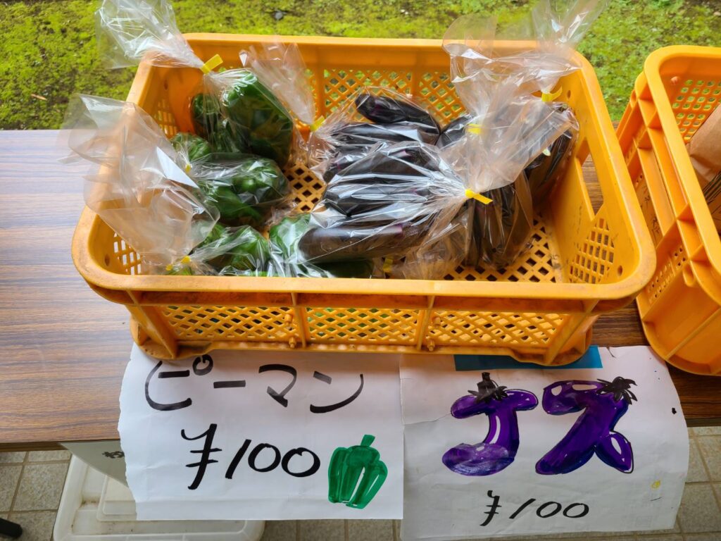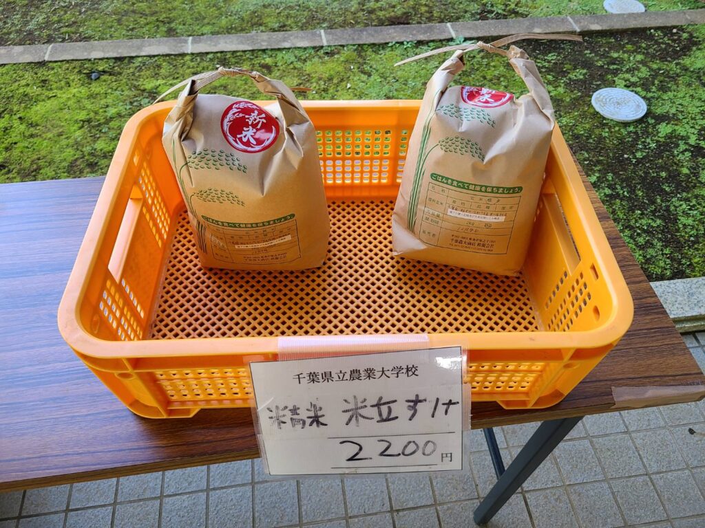 本日(10月27日)のラインナップは、ナス、ピーマン、新米(粒すけ)です。校舎玄関前にて販売しています。